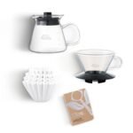 This coffee brewing kit is designed for experts or beginners. It contains a glass wave dripper for making 2-4 cups of coffee, 100 Wave 185 filters, a 500ml glass server, and a coffee journal.